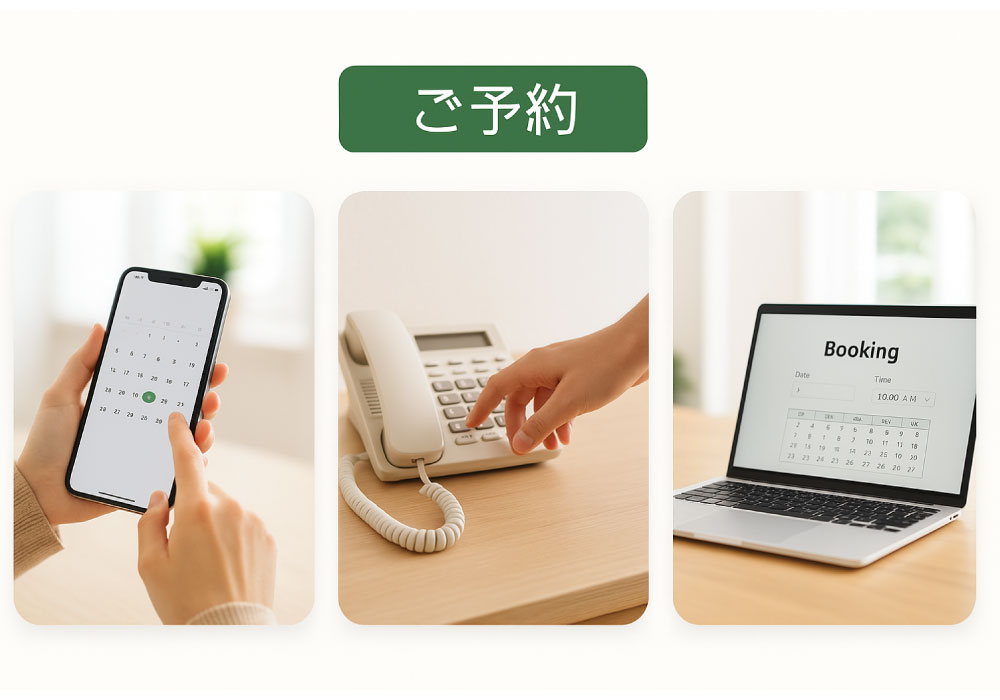 施術後にお会計。ご希望に応じて次回予約を承ります(受付/お電話/WEB可)。